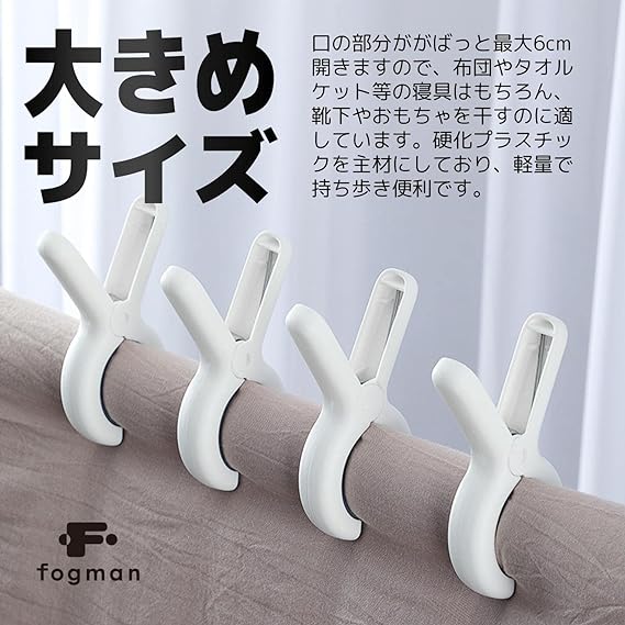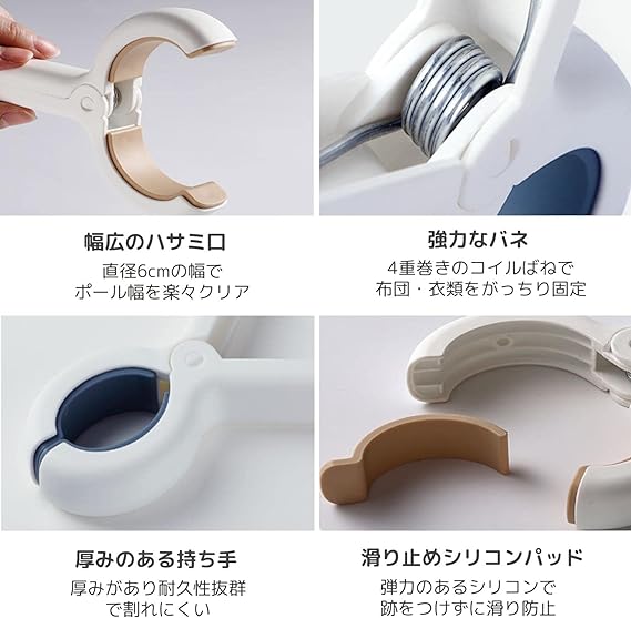 【大き目サイズ】口の部分ががばっと6cm開きますので、布団やタオルケット等の寝具はもちろん、靴下やおもちゃを干すのに適しています。硬化プラスチックを主材にしており、軽量で持ち歩き便利です。