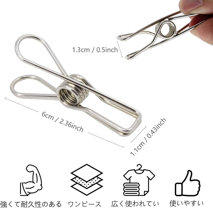 Skroad洗濯バサミ、防錆洗濯バサミ ステンレス防風洗濯ばさみ 100パック、室内 室外強力グリップ洗濯バサミ、洗濯物干しピンチ 布団干し 物干し シルバー, おやつ袋用ハンガーバサミ、タオル、写真、紙、キッチン、オフィス 洗濯用品 物干し多用途1