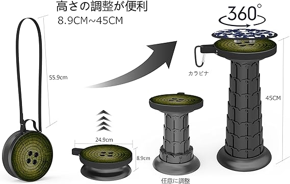 ALEVMOOM 椅子 折りたたみ椅子 おりたたみいす 伸縮スツール 折りたたみいす 折り畳み椅子 高さは45まで調整可能 伸縮式 耐荷重200kg 軽量 コンパクト 持ち運び便利 アウトドア キャンプ ハイキング 釣り BBQ 屋内 踏み台 運動会 体育館 (クッション、収納バッグ、カラビナ含め)(木の年輪)1