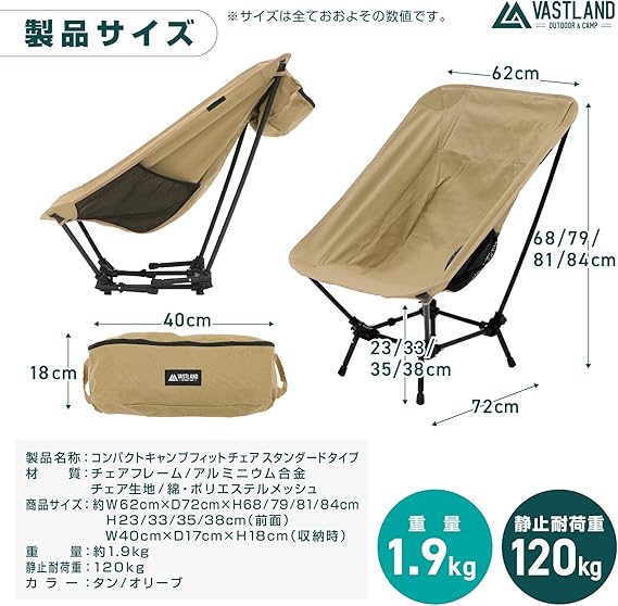 ヴァストランド VASTLAND キャンプフィットチェア スタンダードタイプ 高さ4段階調節 折りたたみ キャンプ 椅子 ローチェア 帆布 コットン 焚き火 タン1