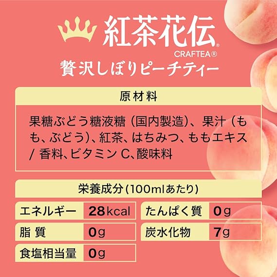原材料:果汁(もも、ぶどう)、果糖ぶどう糖液糖(国内製造)、はちみつ、紅茶、香料、ビタミンC、酸味料