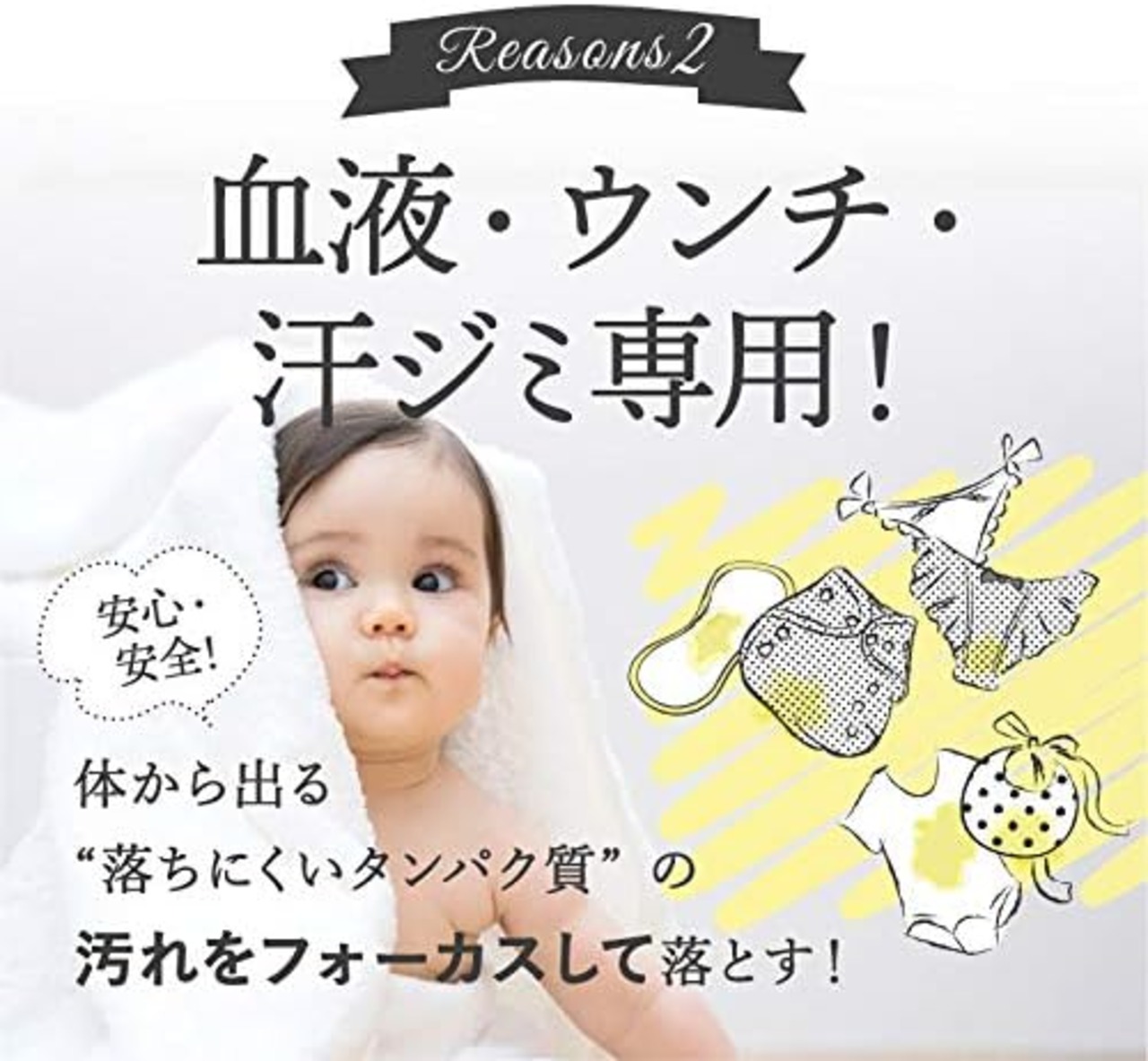 【身体から出る汚れにフォーカス!】布おむつに付いた汚れ、下着に付いた血液のシミ、ベビーの母乳やミルクの吐き戻し・食べこぼし、ワイシャツの襟汚れや汗ジミなど、身体から出る”落ちにくいタンパク質”の汚れにフォーカスして落とします。