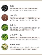 Point1: 黒豆、ルイボス、カモミールなど、ゆらぎを感じる女性のためのブレンド。軽やかなカモミールの香りに、黒豆でまろやかな味。すっきりとしたルイボスティーの後味が特徴。