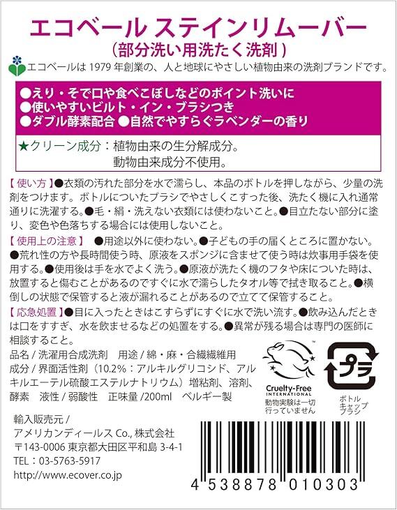 ECOVER(エコベール) エコベール 洗濯洗剤 部分洗い洗剤 ステインリムーバー ラベンダーの香り 200ml ecover 襟汚れ 袖汚れ 染み抜き ベビー 衣類用