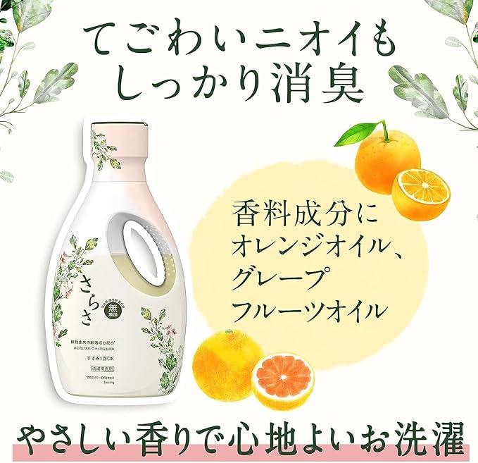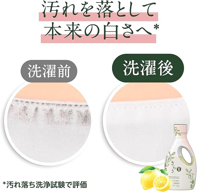 〈洗濯洗剤〉界面活性剤(25%:ポリオキシエチレンアルキルエーテル、アルキルエーテル硫酸エステル塩、純せっけん分(脂肪酸塩)、直鎖アルキルベンゼンスルホン酸塩)、安定化剤、pH調整剤、水軟化剤(クエン酸)、ケア成分(コットンミルク) * 、酵素 /* コットンミルク:コットンにも含まれる植物由来のケア成分のこと。