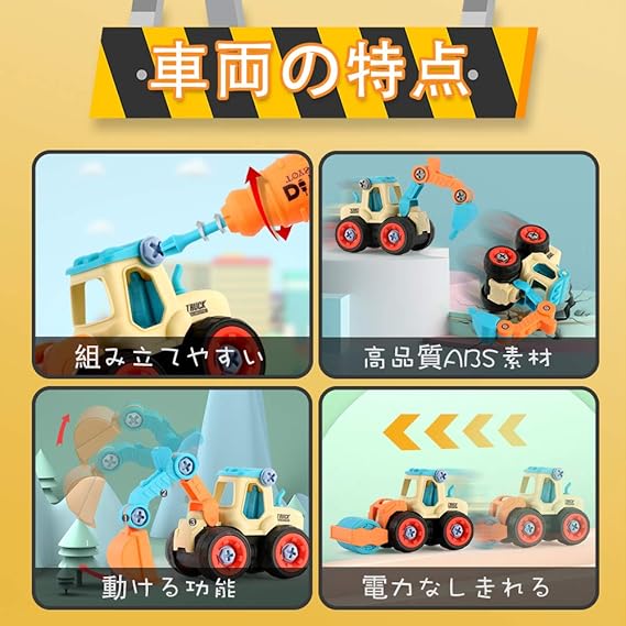 【 組み立てできるのDIY建設車両セット】レンチ付き ねじ、タイヤなどの部品を取り外しでき、ショベルカー ボール盤 ローラーカー ブルドーザー 4種類の建設車両のを組み立てできます!子供は自分の認識によって 自由に想像して 色々な工事カーを作られて 思う存分遊べます。