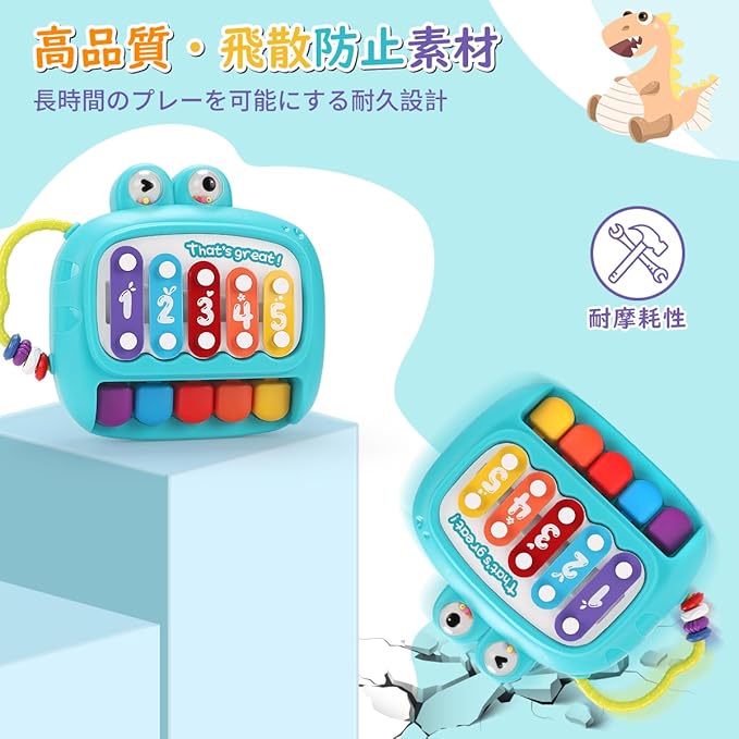 【かわいい形】恐竜の形がかわいい、ピアノの音色の基準が動いている,子供の興味を引いています。ハンドル付きのデザイン。 赤ちゃんがおもちゃをつかんでどこにでも簡単に持ち運べるようになります。各機能には、それぞれ異なるプレー方法がある,赤ちゃんの注意を引き、赤ちゃんを最も楽しくすることができます。見た目の可愛さはもちろんのこと、幼児の欲求を満たすよいおもちゃだ!