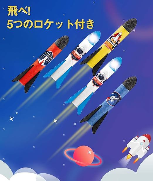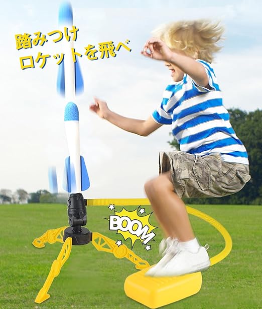 走ってジャンプして踏みつけてロケットを発射します。スポンジ製のロケットを台座にセットして 発射角度を決めたら、ポンプを踏むだけ! 空気を圧縮してロケットが遠くまで飛んでいきます。子供をゲームなどのスクリーンから遠ざけて、アクティブに外で夢中になって遊ぶのに最適です。アウトドアや外遊びにピッタリ。
