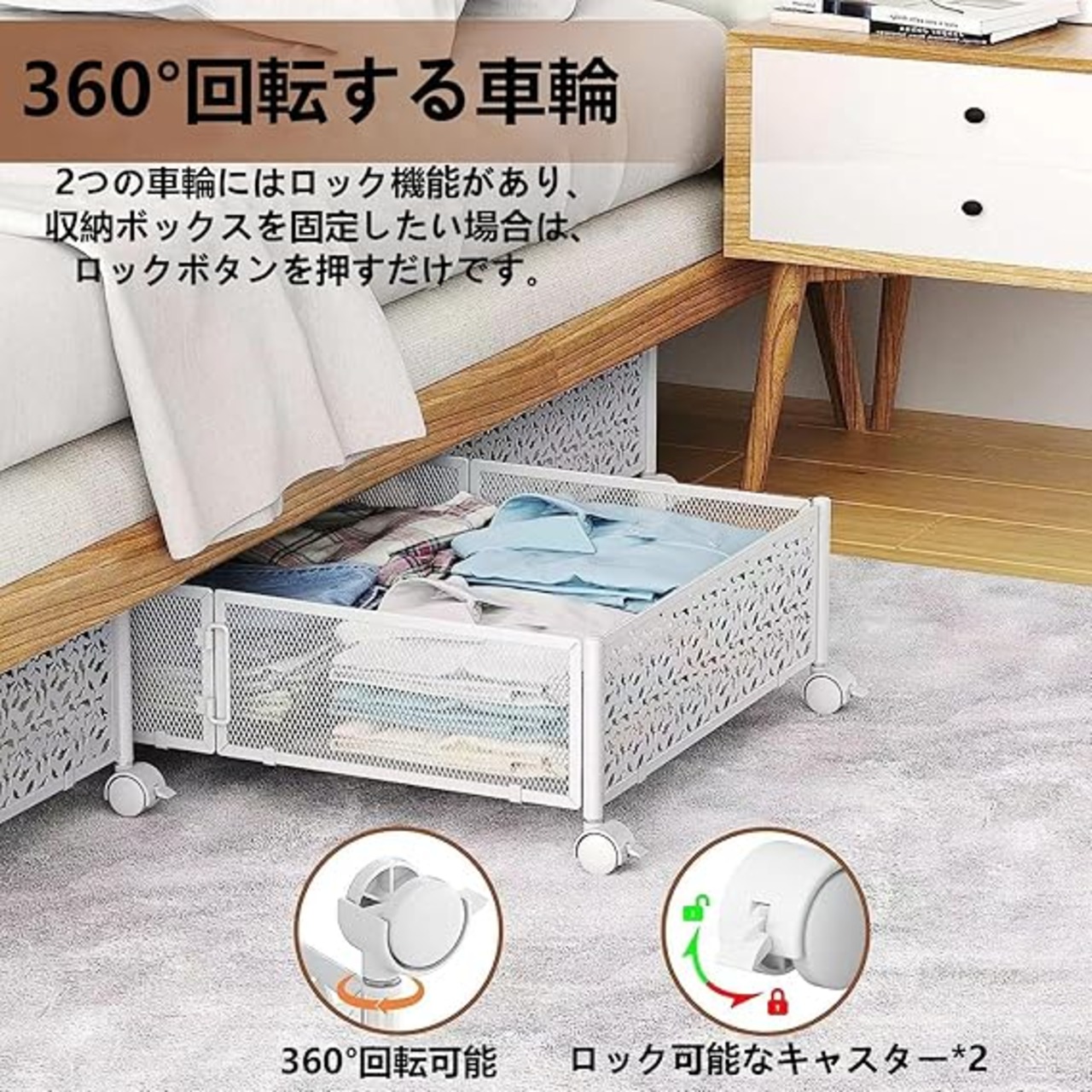 【大容量 &キャスター付き】ベッド下収納引き出しは、衣類、本、おもちゃ、電化製品、その他の雑貨を置くのに十分なスペースがあります。4つの滑らかなホイールを装備。 ベッド下収納 キャスター付き、使用時に床や敷物に沿って簡単に滑ります。 2つの車輪にはロック機能が付いており、立ち止まる必要がある場合は、ロック機構を軽く押すだけです。 盛り上がったデザインで、ホコリや汚れからアイテムを守ります