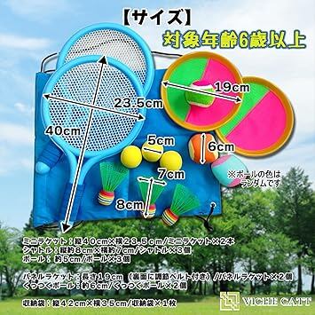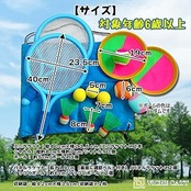 【サイズ】 ミニラケット:縦40cm×横23.5cm シャトル:縦約8cm×横約7cm ボール: 約5cm パネルラケット:長さ19cm (裏面に調節ベルト付き) くっつくボール:約6cm 収納袋:縦42cm×横35cm ※対象年齢6歳以上