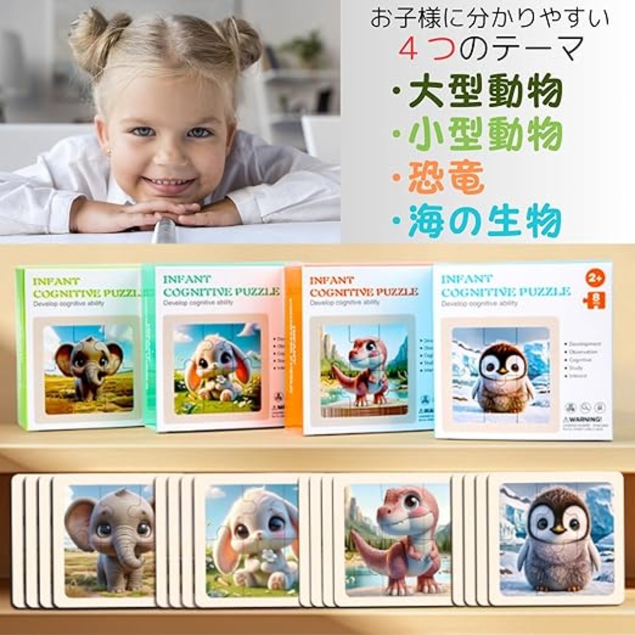 小さなお子様向けのジグソーパズルです。4つのカテゴリーで各8枚入っています。どれも魅力あふれるタッチで描かれており、観賞用としてもお使いいただけます。