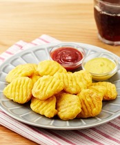 鶏肉(タイ又は日本)、鶏皮、コーンフラワー、小麦粉、パン粉、でん粉加工品、食塩、植物油、でん粉、牛乳、醸造酢、香辛料、ぶどう糖、卵白末、たん白加水分解物、チキンスープパウダー、チキン風味調味料、全卵末、揚げ油(植物油)/加工デンプン、調味料(アミノ酸等)、くん液、ピロリン酸Na、酸味料、ベーキングパウダー、乳化剤、増粘剤(キサンタンガム)、酸化防止剤(ビタミンE)、着色料(クチナシ、パプリカ色素)、香料、(一部に卵・乳成分・小麦・大豆・鶏肉を含む)
