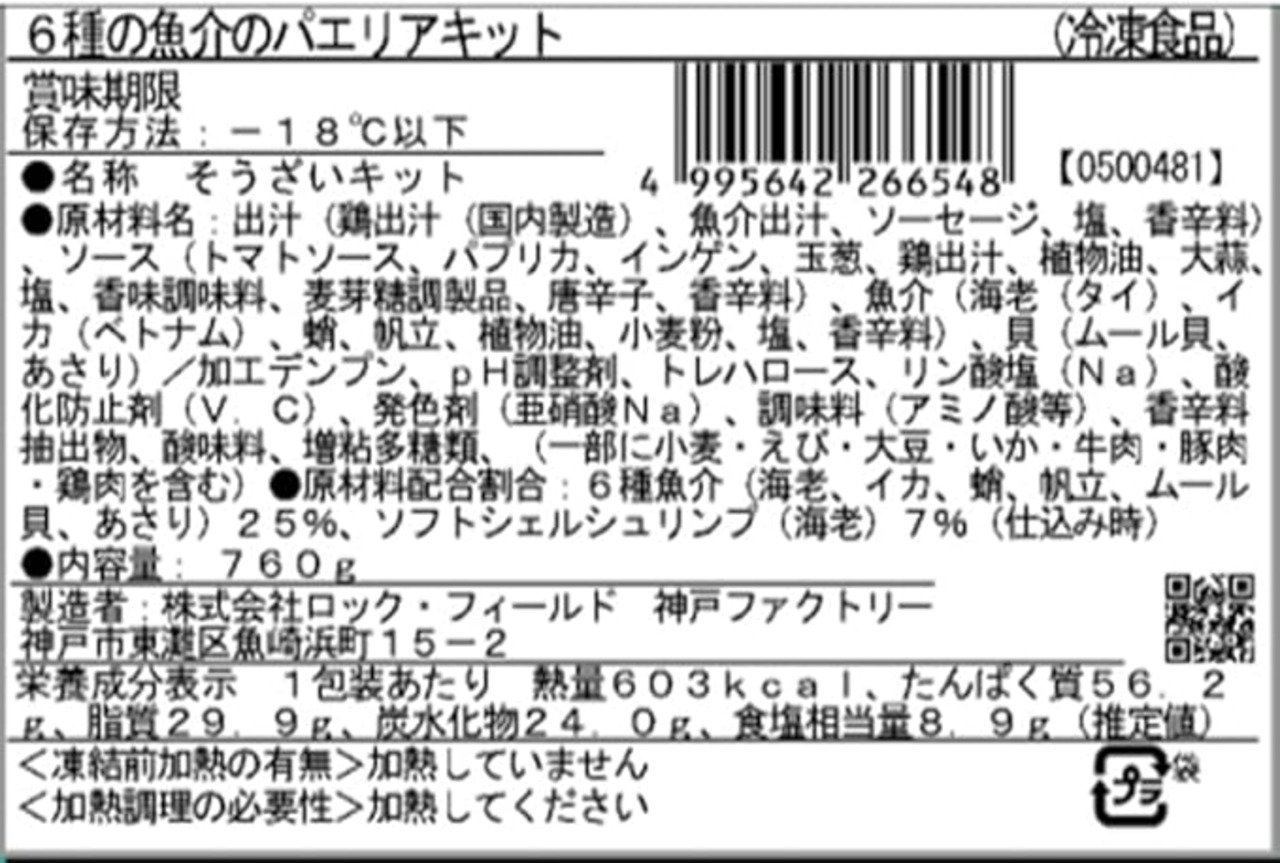 原材料:出汁(鶏出汁(国内製造)、魚介出汁、ソーセージ、塩、香辛料)、ソース(トマトソース、パプリカ、インゲン、玉葱、鶏出汁、植物油、大蒜、塩、香味調味料、麦芽糖調製品、唐辛子、香辛料)、魚介(海老(タイ)、イカ(ベトナム)、蛸、帆立、植物油、小麦粉、塩、香辛料)、貝(ムール貝、あさり)