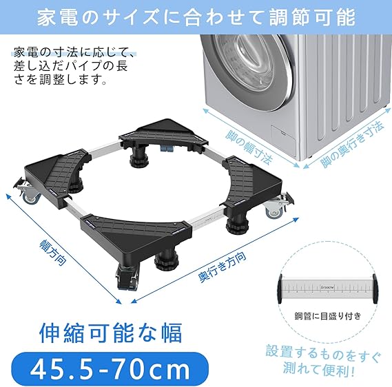 Grpoche 洗濯機 台 キャスター付き 洗濯機 置き台 スライド台 360度回転 4足4輪 高さ調整 ジャッキ付き 移動できる洗濯機パン 幅/奥行:44.5cm~70cm 昇降可能 減音防振 耐荷重500kg (ブラック)1