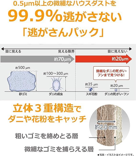 立体三層構造の不織布で、ダニのフンや死がい、花粉など0.5μm以上の微細なハウスダストも約99.9%逃さず、排気の清潔さに配慮する