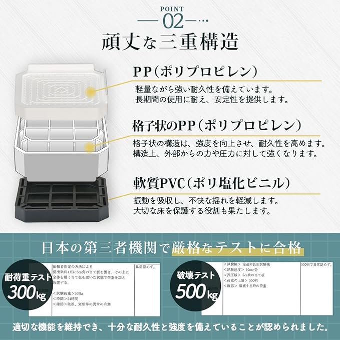 【三重構造】強度を保つために三層構造を採用。PP素材の格子状デザインと、ゴムに近いPVC素材を組み合わせることで、振動や揺れに対する優れた耐性を実現しました。また、床面のキズ防止や滑り止め効果も期待できます。