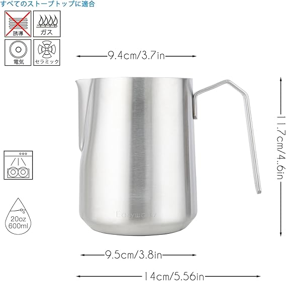 【ラテアートパートナー】 このカップは、ラテ、チョコレート、コーヒーのミルクを泡立てるのに最適で、また、水ジュースやその他の温かいものでも冷たいものでも注ぐことができるアイテムにも最適です。 レーザーエッチングされた測定ラインにより、安定した注ぎが保証され、コーヒーの無駄が最小限に抑