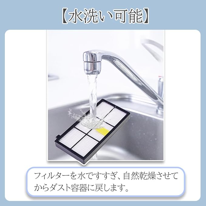 水洗い可能です。フィルターを水ですすぎ、乾燥した状態でダスト容器に戻してください。