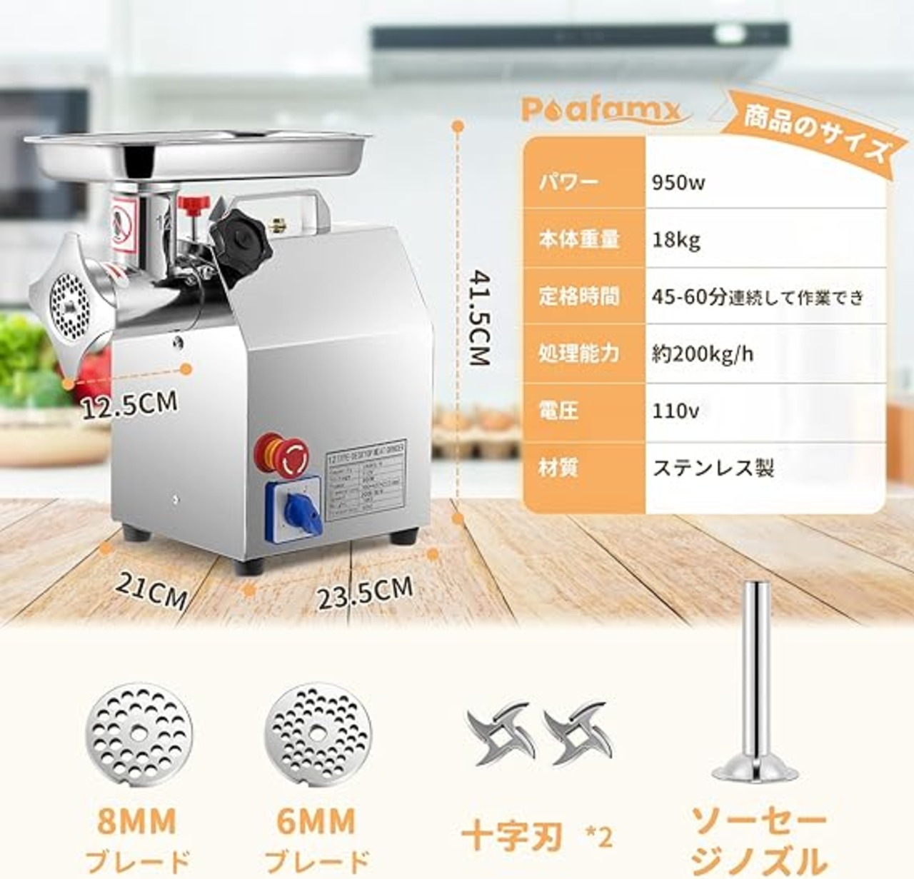 Poafamx 電動ミンサー ミンチ機 6mm/8mm刃付き 200kg/h 肉ひき/野菜ひき/腸詰め/味噌作り ステンレス製 (110v、950w)1
