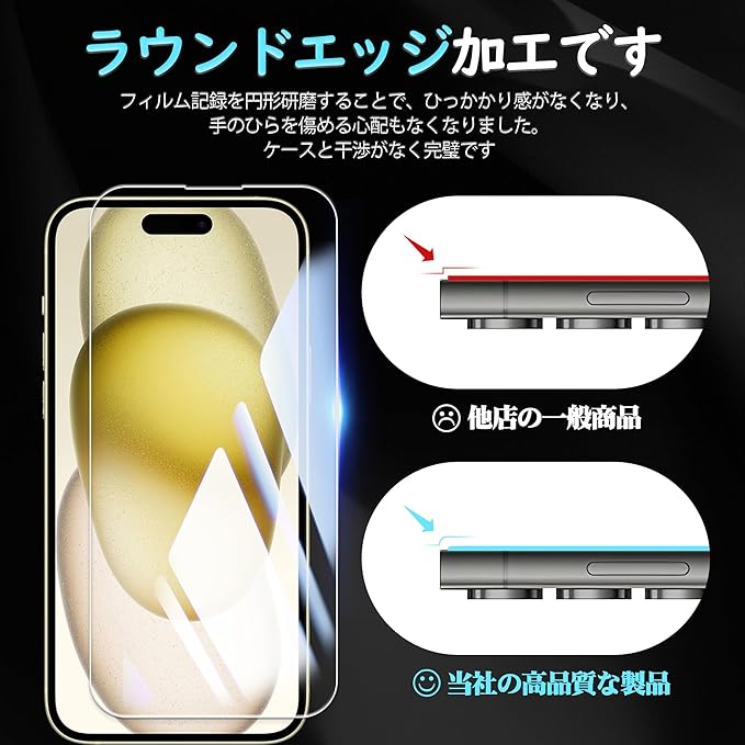 【2+2枚セット】ガイド枠付き KPNS 日本素材製 強化ガラス iPhone15 用 ガラスフィルム カメラフィルム カバー 保護フィルム1