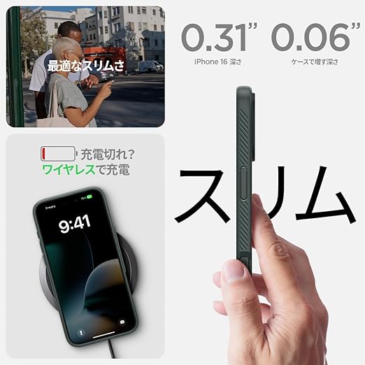 【MagSafe・ワイヤレス充電対応】 程よい厚さでケースを装着したまま「ワイヤレス充電」が行えます。MagSafe高速充電は可能ですが、MagSafe専用マグネットが搭載されていないため付着は対応していません。