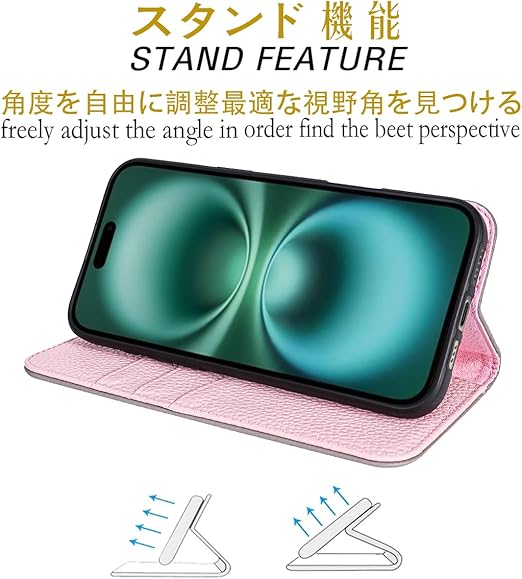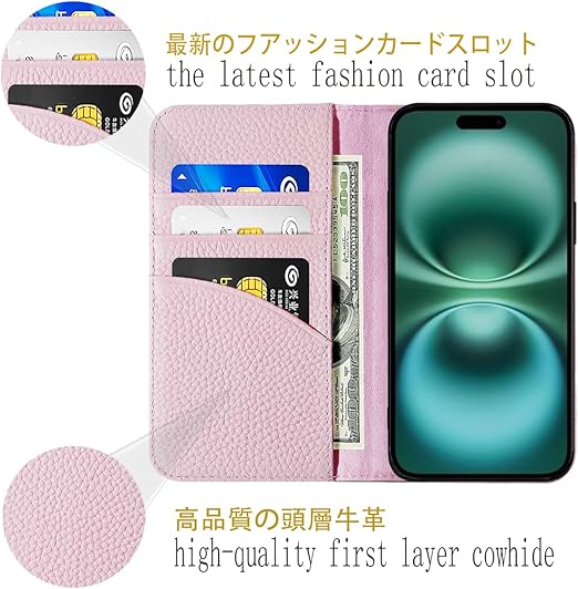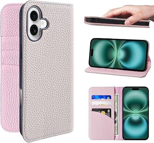 NanHou iPhone 16 Plus ケース 本革 手帳型 カバー 耐衝撃 保護 カバー 本革 内蔵マグネッ RFIDト 財布型 携帯カバー カードポケット スタンド機能 - グレー/ピンク1