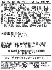 原材料:(麺)小麦粉、小麦たん白、還元水飴、食塩、加工澱粉、酒精、かんすい、クチナシ色素(ス-プ)ラード、醤油、ポークエキス、ポークペースト、還元水飴、砂糖、食塩、ゼラチン、酵母エキス、香辛料、酒精、調味料(アミノ酸等)、カラメル色素、増粘剤(加工澱粉)、乳化剤、増粘多糖類、(原材料の一部に小麦、大豆、鶏肉、豚肉、ゼラチンを含む)