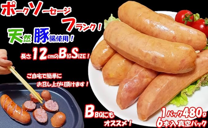 ・「天然豚腸使用」の「ポークソーセージフランク」!長さ「12cm」の「ビッグサイズ」!食べ応え十分!ご自宅・BBQでも美味しくお召し上がり頂けます!1パック「6本入り」!通常のソーセージの「約2倍以上」のサイズ感!「パリッ」っとした食感!・・中身は「ジューシー」柔らか食感!お子様〜お年寄りまで美味しくお召し上がり頂けます!