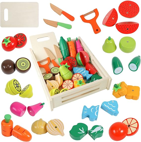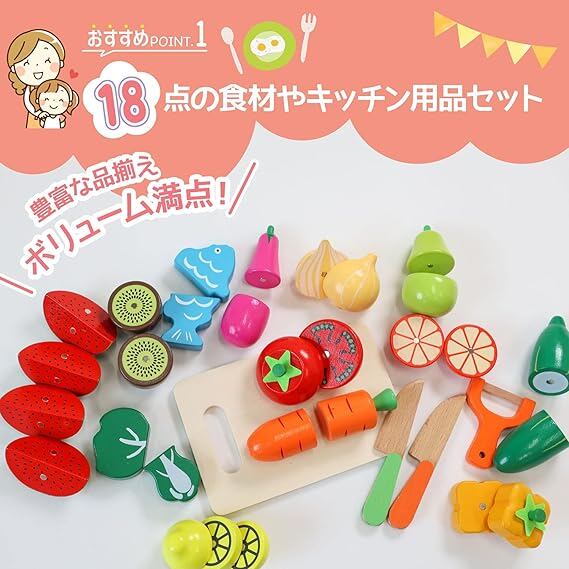 【届いてすぐあそべる18点セット】種類豊富な木製ピース18点セット。壊れにくく温かみのある木製パーツで、お子様の知育におすすめです。包丁だけでなく、皮むきごっこが楽しめるピーラーもついているので、遊びの幅が広がります。包丁は2本ついているので、お友達や家族と一緒に遊べます。