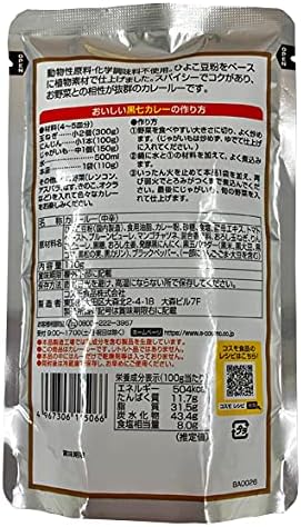 原材料:ひよこ豆粉(国内製造)、食用油脂、カレー粉、砂糖、食塩、酵母エキス、トマトペースト、プルーンピューレ、マンゴチャツネ、混合香辛料、おろし玉ねぎ、りんごピューレ、黒糖、おろし生姜、発酵黒にんにく、黒五パウダー(黒米・黒大豆・黒胡麻・黒松の実・黒カリン)、ブラックペッパー(一部にりんご、ごま、大豆を含む)