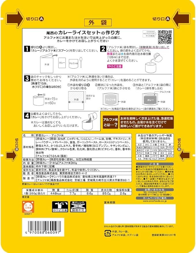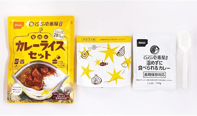 原材料 【野菜カレー】野菜(玉ねぎ、じゃがいも、にんじん)、パーム油、砂糖、デキストリン、カレーパウダー、トマトペースト、食塩、ガーリックペースト、ローストココナッツペースト、酵母エキス、かつおぶしエキス、香辛料/増粘剤(加工デンプン、キサンタンガム)、調味料(アミノ酸等)、カラメル色素、乳化剤、酸化防止剤(ビタミンC)、香料、香辛料抽出物【アルファ米】うるち米(国産)