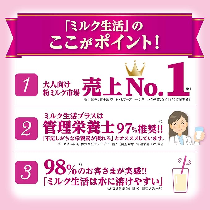 ラクトフェリン、シールド乳酸菌、ビフィズス菌BB536、カルシウム、中鎖脂肪酸、鉄の他、11種類のビタミン、7種類のミネラル、食物繊維、オリゴ糖など、大人に必要な栄養素をバランスよく摂取できます