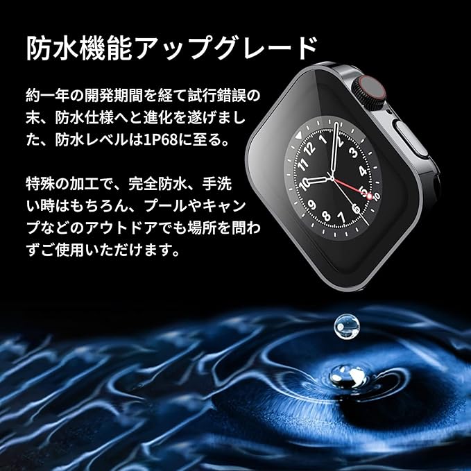 【防水防塵】Apple Watchケース特殊加工による防水機能により、 手を洗う時はもちろん汗をかいた時、シャワーを浴びた時にもかかわらずにアップルウォッチをご使用できます。※アップルウォッチ本来の防水性能を向上させるものではありません。プールや海などの水場でのご使用時はアップルウォッチの説明に従い、スキューバダイビング、ウォータースキーなど、水圧が高くなったり、所定の水深より深く潜るようなアクティビティはしないでください。