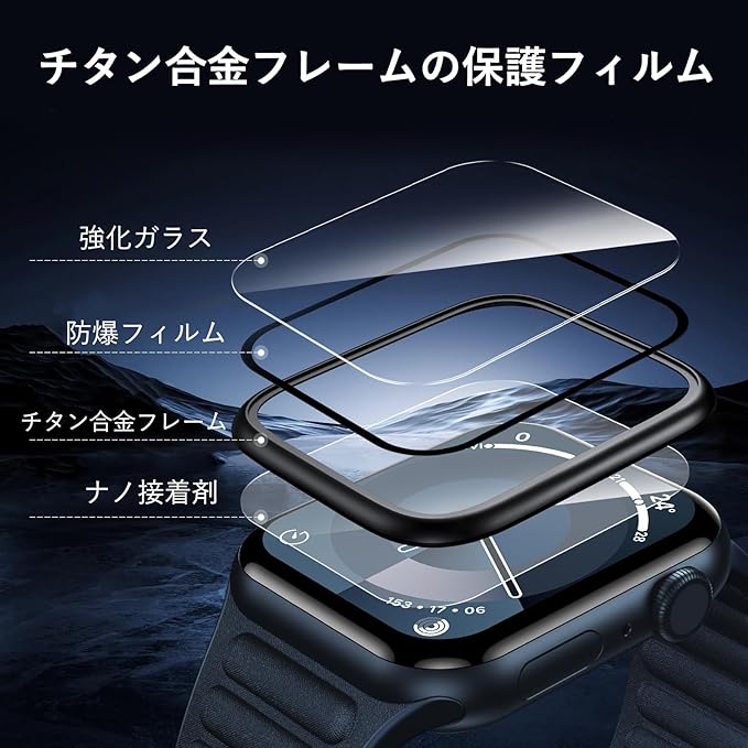 【チタン合金フレームのApple Watch保護フィルム】2024年最新モデルチタン合金フレームのApple Watch保護フィルムは、Apple Watchオリジナル製品と同じ材料のチタン合金+9H硬度の強化ガラスフィルムのデザインを採用し、Apple Watchの画面全体を360度しっかり保護。耐摩耗性、耐衝撃性、衝突に対し画面全体をしっかり保護します。