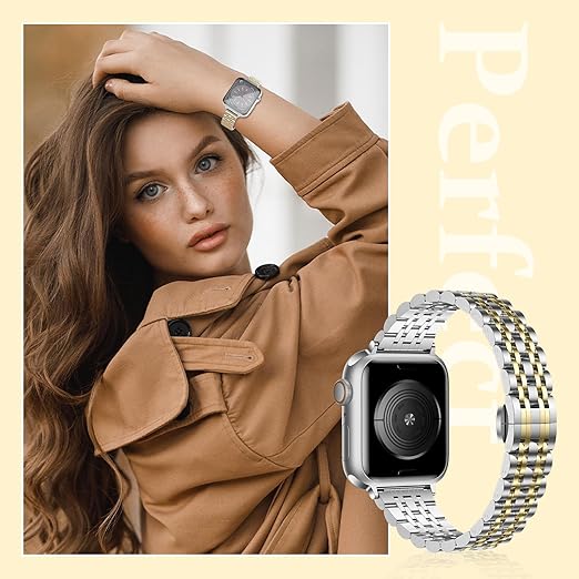 LanQii バンドコンパチブル Apple Watch Series 10/9/8/7/6/5/4/3/2/1/SE/SE 2/Ultra 2/Ultra 対応 (46mm 42mm 44mm 45mm 49mm) コンパチブル アップルウォッチ 用 バンド ステンレスメタル レディース用 交換ストラップ 長さ調整簡単 女性ウォッチバンド シルバー&ゴールド1