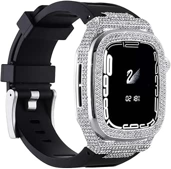 ステンレススチール ストロングアーマー ウォッチケース + キラキラダイヤモンド + シリコンバンド Apple Watch 44mm 45mm用 (ブラック+シルバー)1