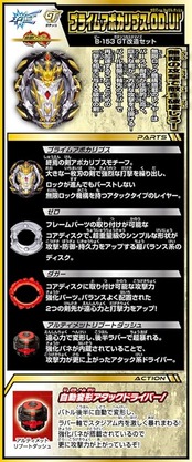 セット内容:レイヤー(2),ガチンコチップ(2),ウエイト(2),ベース(2),ディスク(3),フレーム(1),ドライバー(4),ステッカー(1),正しい遊び方説明書(1),ベイコードカード(1)