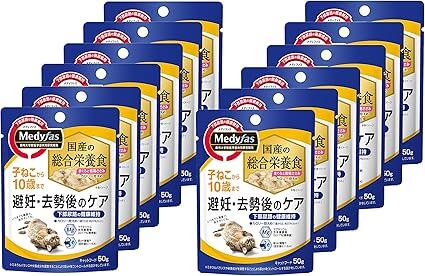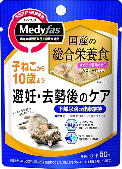 メディファス ウェット キャットフード 避妊・去勢後のケア 子ねこから10歳まで まぐろと若鶏ささみ 【総合栄養食/下部尿路/pHコントロール/国産】 50gx12 (まとめ買い)