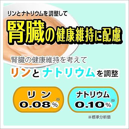 栄養成分:粗たんぱく質:6.8%以上、粗脂肪:4.3%以上、粗繊維:0.1%以下、粗灰分:0.8%以下、水分:83.0%以下、エネルギー:39kcal