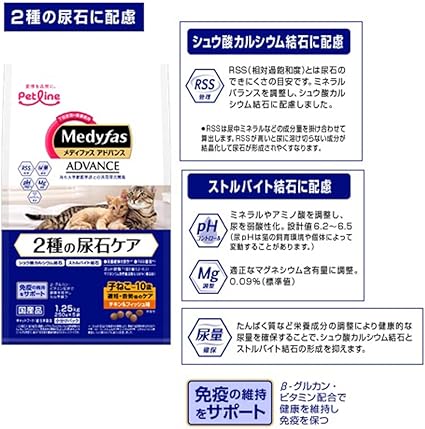 メディファスアドバンス キャットフード 2種の尿石ケア 子ねこから10歳まで 避妊・去勢後のケア チキン&フィッシュ味【シュウ酸カルシウム/ストルバイト/国産/アルミ小分け】 1.25kg(250g×5)