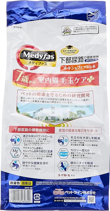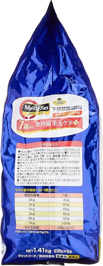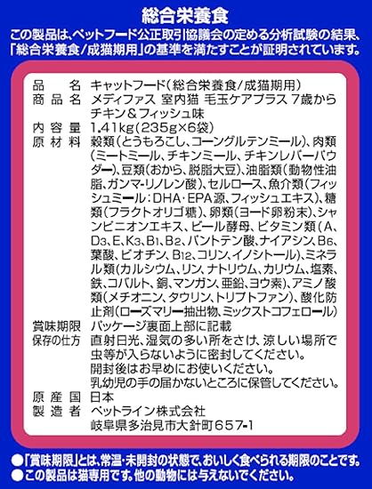 メディファス キャットフード 室内猫 毛玉ケアプラス 7歳から チキン&フィッシュ味 【下部尿路/pHコントロール/麻布大学共同開発/国産/アルミ小分け】 1.41kg(235g×6)