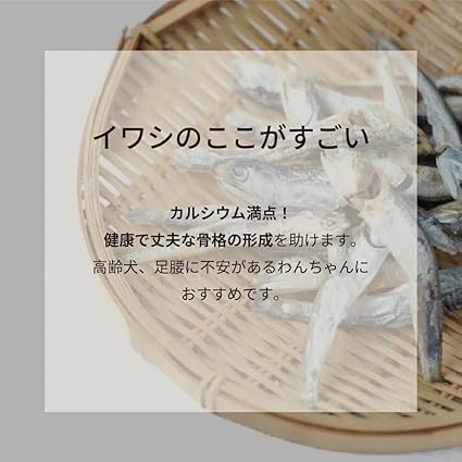 イワシはカルシウム満点。健康で丈夫な骨格の形成を助けます。高齢犬、足腰に不安があるわんちゃんにもおすすめです。