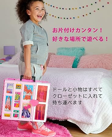 【内容】お子さまに無限のルックスと無限のストーリーの可能性を与えてくれるゆかいなバービードリームクローゼットです。モダンなピンクのクローゼットは、開くと幅71cm以上高さ51cm以上で、2階を作るポップアップエリアを含む10以上の収納スペース、全身が映るおおきなミラー、ランドリーシューターとパソコンデスクなどがあります。付属の36種類以上のこもので400通りのファッションコーディネートを楽しめます。ファッションはパーティー、おでかけ、おしごと(看護師とライフセーバー)の4つシーンに合わせられて、
