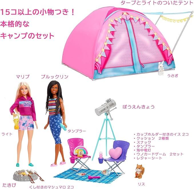 【内容】ネットフリックスで日本語アニメが配信中の「バービー・イット・テークス・トゥー」の二人のバービー、マリブとブルックリンのドールと、最高のキャンプ場を作りアウトドアアドベンチャーを楽しむためのグッズが揃った楽しいキャンピングプレイセットです。ドールが4体も入れる大きな布のテントには、イルミネーションを演出するライティングがついています。ファイヤーピットの焚火では、折りたたみ椅子とブランケットで仲良く火を囲んでマシュマロを焼いて食べたり、カードゲームのウノで遊んだり、楽しい時間の始まりです。望