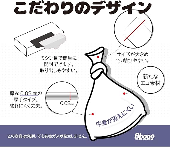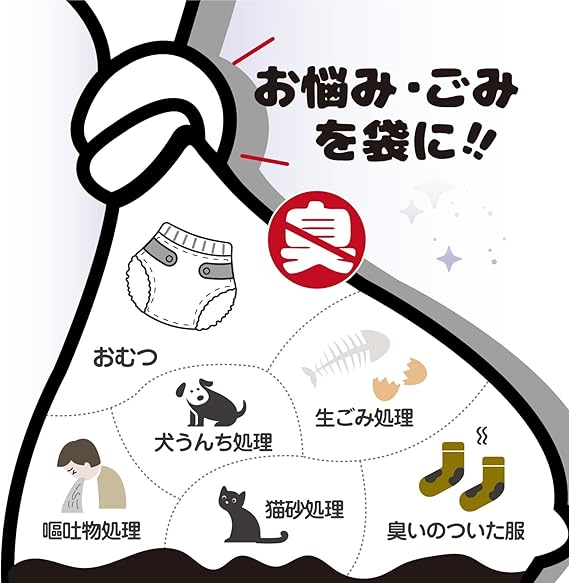臭いをしっかり遮断:最高の気体バリア性があるEVOH樹脂(エバール)を採用して、びっくりするほどの臭わない袋を作り出します。強烈な臭いを放つ子供のおむつを袋に入れて縛った瞬間、ニオイが激減します。
