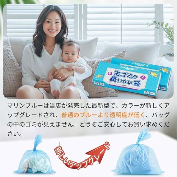 【圧倒的な防臭力】素材:ポリエチレン(PE)、EVOHフィルム。本社特有革新的な技術で多層のフィルム(PE)とEVOHフィルム(防臭フィルム)共押出により多層化される匂いを完全に抑えらる超強力な「ニオイ斬り」防臭袋です。抜群な消臭力を持ちながら破れにくくて嫌な臭い匂いをしっかりゴミ袋に閉じ