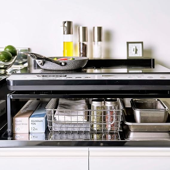 商品サイズ:約W56XD47XH20.5〜21.5cm(アジャスター含む) 内寸:収納部:約W56×D40cm 棚:約W56×D7×H6cm ラック下収納部:約W53×D44×H13.5〜14.5cm 収納部背面:約W42×H3cm 対応サイズ:幅約56cm・奥行き約47cm以上のコンロ台 【 注意 】製品は卓上IHクッキングヒーター専用のラックになります。