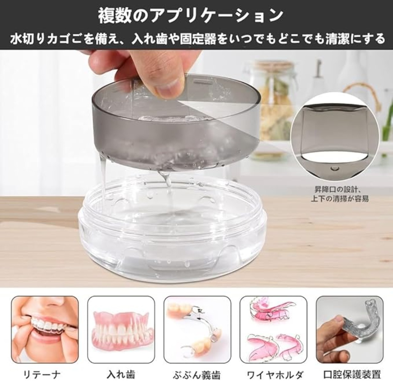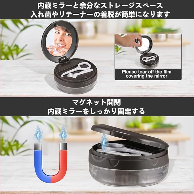 入れ歯ケース 入れ歯洗浄ケース ミラー付き マウスピース ケース リテーナーケース 洗浄用 矯正ケース 義歯ケース 水漏れしない 三重構造 水切りカゴ付 入れ歯洗浄容器 洗浄・保管 多機能 入れ歯収納ボックス 義歯収納容器 マグネット開閉 マット仕上げ 持ち運び便利 お手入れ簡単 携帯 旅行用ブラシとリムーバー付き (黒)