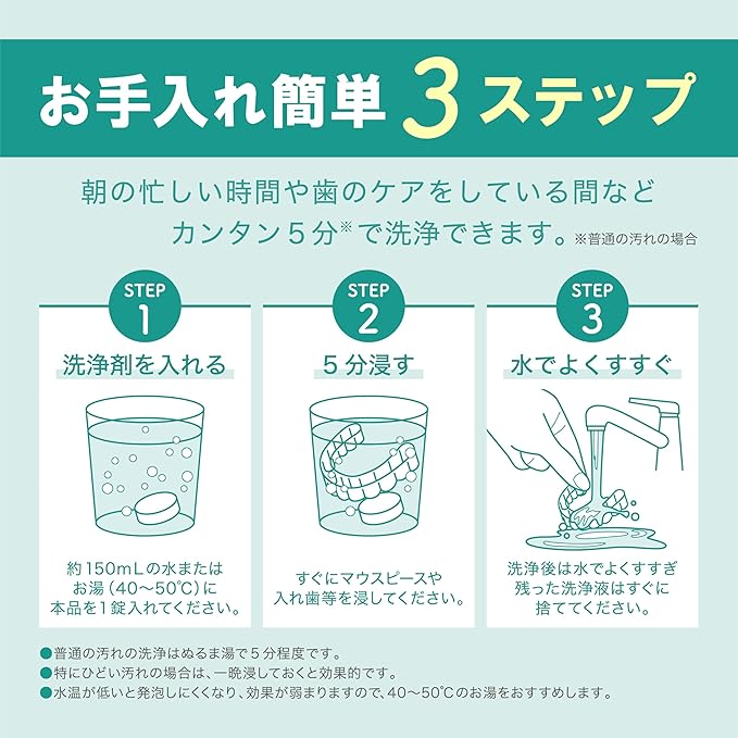 【お手入れ簡単!5分で洗浄】矯正用リテーナー・マウスピース・入れ歯などに使える除菌率99.9%※の洗浄剤です。タンパク汚れ、ニオイ成分、カビを酵素のチカラでしっかりと洗浄します。洗浄剤のにおいが残りにくく、ミントの香りでスッキリ!※全ての菌を除菌するわけではありません。(カンジダ菌に対する除菌試験結果)