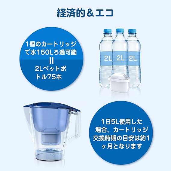 洗浄能力:遊離残留塩素(総ろ過水量200L、除去率80%以上)カートリッジ交換目安:1日3.5L使用で2ヵ月